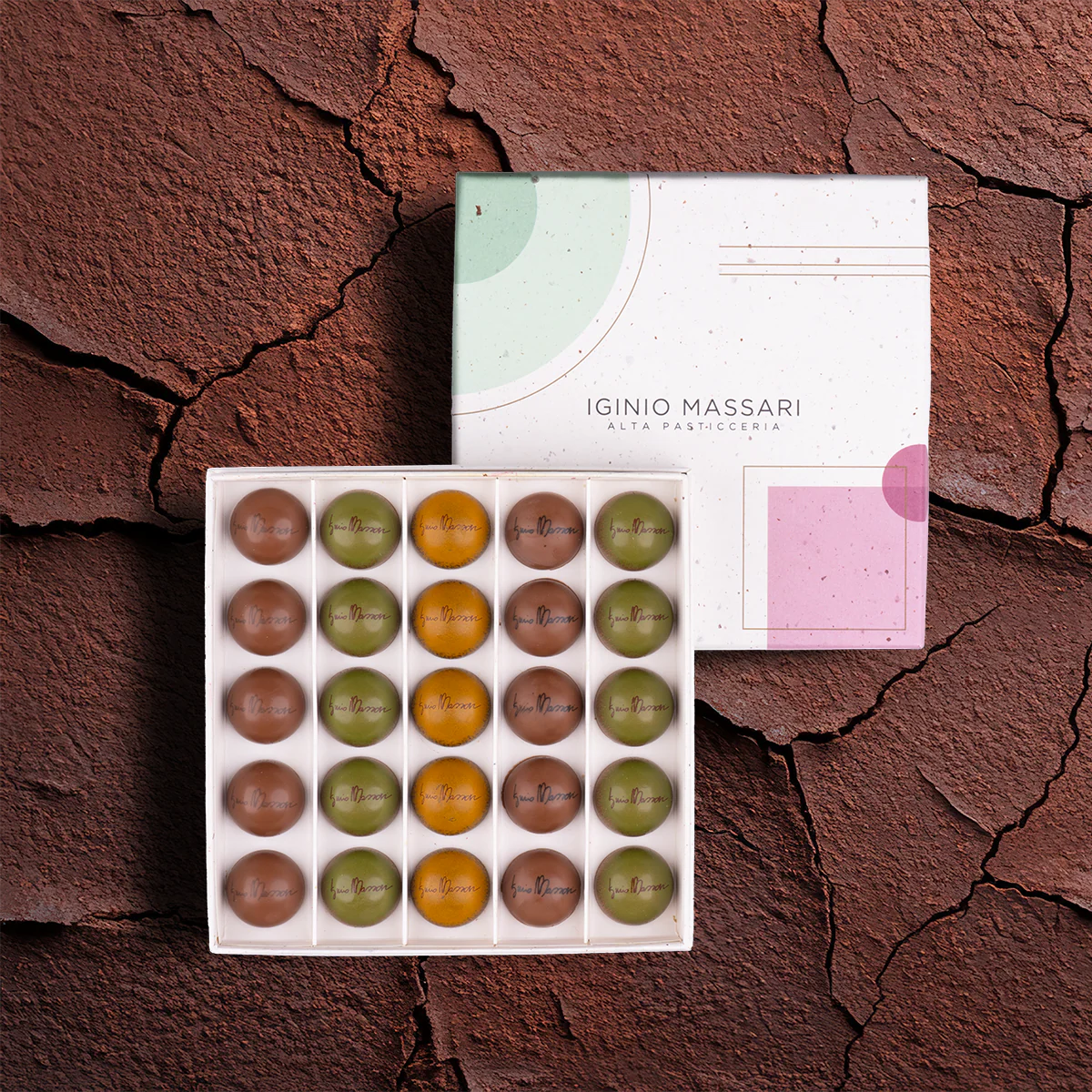 Pistacchio salato: cioccolato al LATTE (zucchero, burro di cacao, LATTE intero in polvere, pasta di cacao, emulsionante: lecitina di SOIA, aroma naturale di vaniglia), cioccolato bianco (LATTE intero in polvere, LATTE scremato in polvere, zucchero, BURRO anidro, burro di cacao, emulsionante: lecitina di SOIA, estratto naturale di vaniglia), pasta di PISTACCHIO (PISTACCHI, estratto di cartamo, colorante: blu patentato V), pasta pralinata (PISTACCHIO tostato, zucchero di canna, zucchero caramellato), BURRO chiarificato liquido, sale, decorazione (zucchero, burro di cacao, cacao magro in polvere, coloranti: E172, E133).